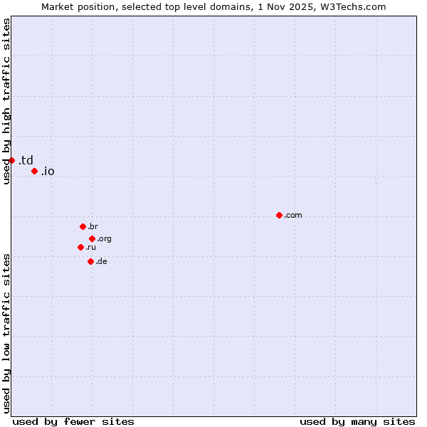TechnologiesContent ManagementServer-side Languages Client-side Languages JavaScript Libraries CSS Frameworks Web Servers Web Panels Operating Systems Web Hosting Data Centers Reverse Proxies DNS Servers Email Servers SSL Certificate Authorities Content Delivery Traffic Analysis Tools Advertising Networks Tag Managers Social Widgets Site Elements Structured Data Markup Languages Character Encodings Image File Formats Top Level Domains Server Locations Content Languages ComparisonCompare with other | Technologies > Top Level Domains > Technology usage comparison Comparison of the usage statistics of .io (British Indian Ocean Territory) vs. .td (Chad) for websitesThis report shows the usage statistics of .io (British Indian Ocean Territory) vs. .td (Chad) as top level domain on the web. See technologies overview for explanations on the methodologies used in the surveys. Our reports are updated daily. UsageThis diagram shows the percentages of websites using the selected technologies. How to read the diagram: