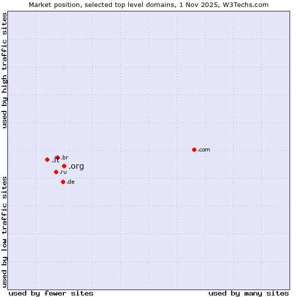 TechnologiesContent ManagementServer-side Languages Client-side Languages JavaScript Libraries CSS Frameworks Web Servers Web Panels Operating Systems Web Hosting Data Centers Reverse Proxies DNS Servers Email Servers SSL Certificate Authorities Content Delivery Traffic Analysis Tools Advertising Networks Tag Managers Social Widgets Site Elements Structured Data Markup Languages Character Encodings Image File Formats Top Level Domains Server Locations Content Languages ComparisonCompare with other | Technologies > Top Level Domains > Technology usage comparison Comparison of the usage statistics of .org (Organizations) vs. .it (Italy) for websitesThis report shows the usage statistics of .org (Organizations) vs. .it (Italy) as top level domain on the web. See technologies overview for explanations on the methodologies used in the surveys. Our reports are updated daily. UsageThis diagram shows the percentages of websites using the selected technologies. How to read the diagram: