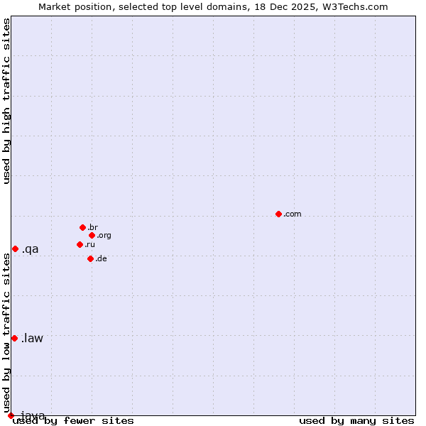 TechnologiesContent ManagementServer-side Languages Client-side Languages JavaScript Libraries CSS Frameworks Web Servers Web Panels Operating Systems Web Hosting Data Centers Reverse Proxies DNS Servers Email Servers SSL Certificate Authorities Content Delivery Traffic Analysis Tools Advertising Networks Tag Managers Social Widgets Site Elements Structured Data Markup Languages Character Encodings Image File Formats Top Level Domains Server Locations Content Languages | Technologies > Top Level Domains > Technology usage comparison Comparison of the usage statistics of .qa (Qatar) vs. .law (Legal industry) vs. .java (Java programming language) for websitesThis report shows the usage statistics of .qa (Qatar) vs. .law (Legal industry) vs. .java (Java programming language) as top level domain on the web. See technologies overview for explanations on the methodologies used in the surveys. Our reports are updated daily. UsageThis diagram shows the percentages of websites using the selected technologies. How to read the diagram: