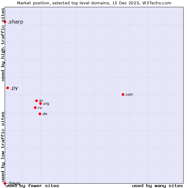 TechnologiesContent ManagementServer-side Languages Client-side Languages JavaScript Libraries CSS Frameworks Web Servers Web Panels Operating Systems Web Hosting Data Centers Reverse Proxies DNS Servers Email Servers SSL Certificate Authorities Content Delivery Traffic Analysis Tools Advertising Networks Tag Managers Social Widgets Site Elements Structured Data Markup Languages Character Encodings Image File Formats Top Level Domains Server Locations Content Languages | Technologies > Top Level Domains > Technology usage comparison Comparison of the usage statistics of .py (Paraguay) vs. .sharp (Sharp brand) vs. .java (Java programming language) for websitesThis report shows the usage statistics of .py (Paraguay) vs. .sharp (Sharp brand) vs. .java (Java programming language) as top level domain on the web. See technologies overview for explanations on the methodologies used in the surveys. Our reports are updated daily. UsageThis diagram shows the percentages of websites using the selected technologies. How to read the diagram: