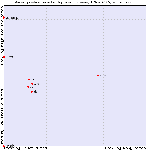 TechnologiesContent ManagementServer-side Languages Client-side Languages JavaScript Libraries CSS Frameworks Web Servers Web Panels Operating Systems Web Hosting Data Centers Reverse Proxies DNS Servers Email Servers SSL Certificate Authorities Content Delivery Traffic Analysis Tools Advertising Networks Tag Managers Social Widgets Site Elements Structured Data Markup Languages Character Encodings Image File Formats Top Level Domains Server Locations Content Languages | Technologies > Top Level Domains > Technology usage comparison Comparison of the usage statistics of .jcb (JCB brand) vs. .sharp (Sharp brand) vs. .nab (National Australia Bank brand) for websitesThis report shows the usage statistics of .jcb (JCB brand) vs. .sharp (Sharp brand) vs. .nab (National Australia Bank brand) as top level domain on the web. See technologies overview for explanations on the methodologies used in the surveys. Our reports are updated daily. UsageThis diagram shows the percentages of websites using the selected technologies. How to read the diagram: