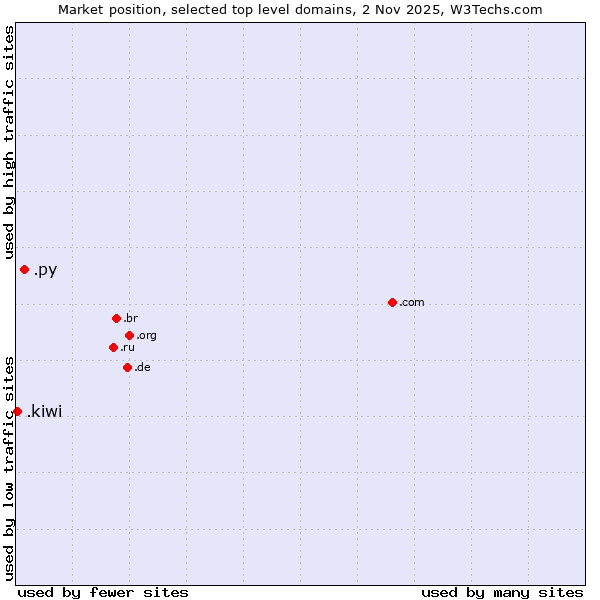 TechnologiesContent ManagementServer-side Languages Client-side Languages JavaScript Libraries CSS Frameworks Web Servers Web Panels Operating Systems Web Hosting Data Centers Reverse Proxies DNS Servers Email Servers SSL Certificate Authorities Content Delivery Traffic Analysis Tools Advertising Networks Tag Managers Social Widgets Site Elements Structured Data Markup Languages Character Encodings Image File Formats Top Level Domains Server Locations Content Languages ComparisonCompare with other | Technologies > Top Level Domains > Technology usage comparison Comparison of the usage statistics of .py (Paraguay) vs. .kiwi (New Zealand culture) for websitesThis report shows the usage statistics of .py (Paraguay) vs. .kiwi (New Zealand culture) as top level domain on the web. See technologies overview for explanations on the methodologies used in the surveys. Our reports are updated daily. UsageThis diagram shows the percentages of websites using the selected technologies. How to read the diagram:
