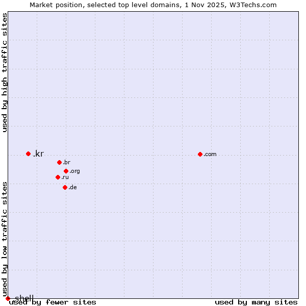 TechnologiesContent ManagementServer-side Languages Client-side Languages JavaScript Libraries CSS Frameworks Web Servers Web Panels Operating Systems Web Hosting Data Centers Reverse Proxies DNS Servers Email Servers SSL Certificate Authorities Content Delivery Traffic Analysis Tools Advertising Networks Tag Managers Social Widgets Site Elements Structured Data Markup Languages Character Encodings Image File Formats Top Level Domains Server Locations Content Languages ComparisonCompare with other | Technologies > Top Level Domains > Technology usage comparison Comparison of the usage statistics of .kr (Republic of Korea (South Korea)) vs. .shell (Shell brand) for websitesThis report shows the usage statistics of .kr (Republic of Korea (South Korea)) vs. .shell (Shell brand) as top level domain on the web. See technologies overview for explanations on the methodologies used in the surveys. Our reports are updated daily. UsageThis diagram shows the percentages of websites using the selected technologies. How to read the diagram: