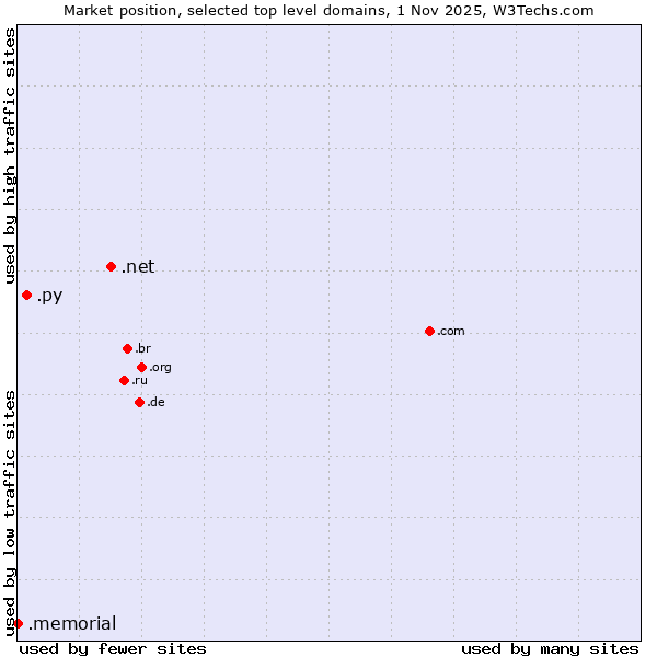 TechnologiesContent ManagementServer-side Languages Client-side Languages JavaScript Libraries CSS Frameworks Web Servers Web Panels Operating Systems Web Hosting Data Centers Reverse Proxies DNS Servers Email Servers SSL Certificate Authorities Content Delivery Traffic Analysis Tools Advertising Networks Tag Managers Social Widgets Site Elements Structured Data Markup Languages Character Encodings Image File Formats Top Level Domains Server Locations Content Languages | Technologies > Top Level Domains > Technology usage comparison Comparison of the usage statistics of .net (Network providers) vs. .py (Paraguay) vs. .memorial (Memorial) for websitesThis report shows the usage statistics of .net (Network providers) vs. .py (Paraguay) vs. .memorial (Memorial) as top level domain on the web. See technologies overview for explanations on the methodologies used in the surveys. Our reports are updated daily. UsageThis diagram shows the percentages of websites using the selected technologies. How to read the diagram: