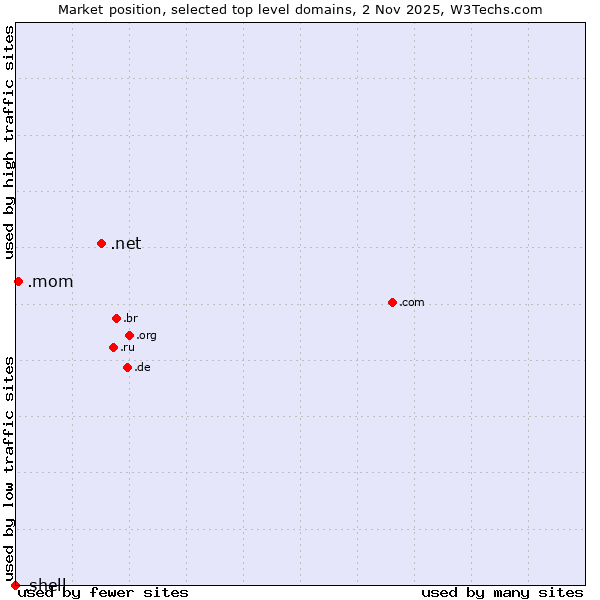 TechnologiesContent ManagementServer-side Languages Client-side Languages JavaScript Libraries CSS Frameworks Web Servers Web Panels Operating Systems Web Hosting Data Centers Reverse Proxies DNS Servers Email Servers SSL Certificate Authorities Content Delivery Traffic Analysis Tools Advertising Networks Tag Managers Social Widgets Site Elements Structured Data Markup Languages Character Encodings Image File Formats Top Level Domains Server Locations Content Languages | Technologies > Top Level Domains > Technology usage comparison Comparison of the usage statistics of .net (Network providers) vs. .mom (Short for mother) vs. .shell (Shell brand) for websitesThis report shows the usage statistics of .net (Network providers) vs. .mom (Short for mother) vs. .shell (Shell brand) as top level domain on the web. See technologies overview for explanations on the methodologies used in the surveys. Our reports are updated daily. UsageThis diagram shows the percentages of websites using the selected technologies. How to read the diagram: