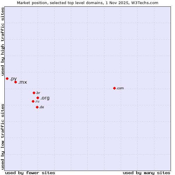 TechnologiesContent ManagementServer-side Languages Client-side Languages JavaScript Libraries CSS Frameworks Web Servers Web Panels Operating Systems Web Hosting Data Centers Reverse Proxies DNS Servers Email Servers SSL Certificate Authorities Content Delivery Traffic Analysis Tools Advertising Networks Tag Managers Social Widgets Site Elements Structured Data Markup Languages Character Encodings Image File Formats Top Level Domains Server Locations Content Languages | Technologies > Top Level Domains > Technology usage comparison Comparison of the usage statistics of .org (Organizations) vs. .mx (Mexico) vs. .py (Paraguay) for websitesThis report shows the usage statistics of .org (Organizations) vs. .mx (Mexico) vs. .py (Paraguay) as top level domain on the web. See technologies overview for explanations on the methodologies used in the surveys. Our reports are updated daily. UsageThis diagram shows the percentages of websites using the selected technologies. How to read the diagram: