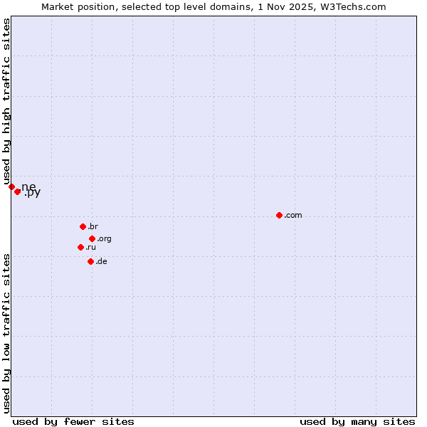 TechnologiesContent ManagementServer-side Languages Client-side Languages JavaScript Libraries CSS Frameworks Web Servers Web Panels Operating Systems Web Hosting Data Centers Reverse Proxies DNS Servers Email Servers SSL Certificate Authorities Content Delivery Traffic Analysis Tools Advertising Networks Tag Managers Social Widgets Site Elements Structured Data Markup Languages Character Encodings Image File Formats Top Level Domains Server Locations Content Languages ComparisonCompare with other | Technologies > Top Level Domains > Technology usage comparison Comparison of the usage statistics of .py (Paraguay) vs. .ne (Niger) for websitesThis report shows the usage statistics of .py (Paraguay) vs. .ne (Niger) as top level domain on the web. See technologies overview for explanations on the methodologies used in the surveys. Our reports are updated daily. UsageThis diagram shows the percentages of websites using the selected technologies. How to read the diagram:
