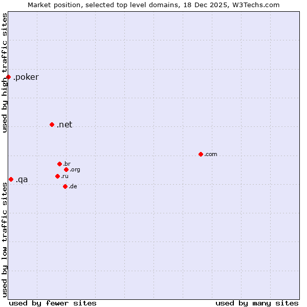 TechnologiesContent ManagementServer-side Languages Client-side Languages JavaScript Libraries CSS Frameworks Web Servers Web Panels Operating Systems Web Hosting Data Centers Reverse Proxies DNS Servers Email Servers SSL Certificate Authorities Content Delivery Traffic Analysis Tools Advertising Networks Tag Managers Social Widgets Site Elements Structured Data Markup Languages Character Encodings Image File Formats Top Level Domains Server Locations Content Languages | Technologies > Top Level Domains > Technology usage comparison Comparison of the usage statistics of .net (Network providers) vs. .qa (Qatar) vs. .poker (Poker) for websitesThis report shows the usage statistics of .net (Network providers) vs. .qa (Qatar) vs. .poker (Poker) as top level domain on the web. See technologies overview for explanations on the methodologies used in the surveys. Our reports are updated daily. UsageThis diagram shows the percentages of websites using the selected technologies. How to read the diagram: