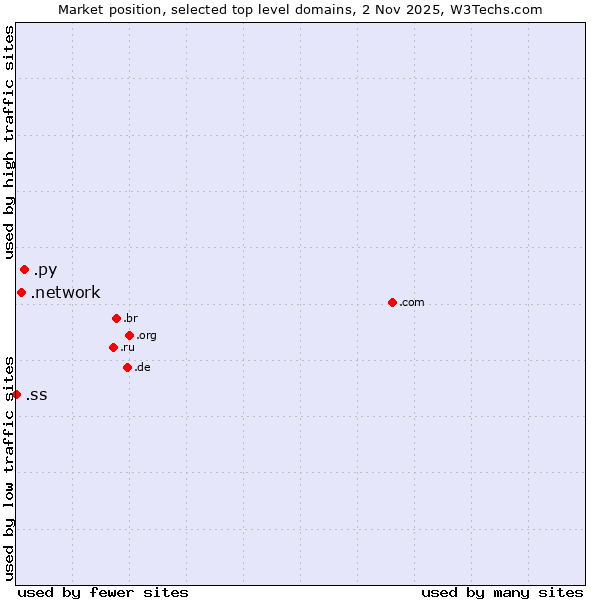 TechnologiesContent ManagementServer-side Languages Client-side Languages JavaScript Libraries CSS Frameworks Web Servers Web Panels Operating Systems Web Hosting Data Centers Reverse Proxies DNS Servers Email Servers SSL Certificate Authorities Content Delivery Traffic Analysis Tools Advertising Networks Tag Managers Social Widgets Site Elements Structured Data Markup Languages Character Encodings Image File Formats Top Level Domains Server Locations Content Languages | Technologies > Top Level Domains > Technology usage comparison Comparison of the usage statistics of .py (Paraguay) vs. .network (Network) vs. .ss (South Sudan) for websitesThis report shows the usage statistics of .py (Paraguay) vs. .network (Network) vs. .ss (South Sudan) as top level domain on the web. See technologies overview for explanations on the methodologies used in the surveys. Our reports are updated daily. UsageThis diagram shows the percentages of websites using the selected technologies. How to read the diagram: