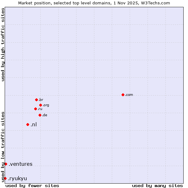 TechnologiesContent ManagementServer-side Languages Client-side Languages JavaScript Libraries CSS Frameworks Web Servers Web Panels Operating Systems Web Hosting Data Centers Reverse Proxies DNS Servers Email Servers SSL Certificate Authorities Content Delivery Traffic Analysis Tools Advertising Networks Tag Managers Social Widgets Site Elements Structured Data Markup Languages Character Encodings Image File Formats Top Level Domains Server Locations Content Languages | Technologies > Top Level Domains > Technology usage comparison Comparison of the usage statistics of .nl (Netherlands) vs. .ventures (New businesses) vs. .ryukyu (Ryukyu, region of Okinawa, Japan) for websitesThis report shows the usage statistics of .nl (Netherlands) vs. .ventures (New businesses) vs. .ryukyu (Ryukyu, region of Okinawa, Japan) as top level domain on the web. See technologies overview for explanations on the methodologies used in the surveys. Our reports are updated daily. UsageThis diagram shows the percentages of websites using the selected technologies. How to read the diagram: