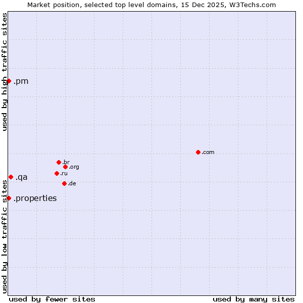 TechnologiesContent ManagementServer-side Languages Client-side Languages JavaScript Libraries CSS Frameworks Web Servers Web Panels Operating Systems Web Hosting Data Centers Reverse Proxies DNS Servers Email Servers SSL Certificate Authorities Content Delivery Traffic Analysis Tools Advertising Networks Tag Managers Social Widgets Site Elements Structured Data Markup Languages Character Encodings Image File Formats Top Level Domains Server Locations Content Languages | Technologies > Top Level Domains > Technology usage comparison Comparison of the usage statistics of .qa (Qatar) vs. .properties (Properties) vs. .pm (Saint Pierre and Miquelon) for websitesThis report shows the usage statistics of .qa (Qatar) vs. .properties (Properties) vs. .pm (Saint Pierre and Miquelon) as top level domain on the web. See technologies overview for explanations on the methodologies used in the surveys. Our reports are updated daily. UsageThis diagram shows the percentages of websites using the selected technologies. How to read the diagram: