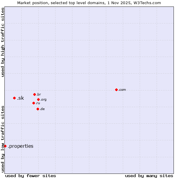 TechnologiesContent ManagementServer-side Languages Client-side Languages JavaScript Libraries CSS Frameworks Web Servers Web Panels Operating Systems Web Hosting Data Centers Reverse Proxies DNS Servers Email Servers SSL Certificate Authorities Content Delivery Traffic Analysis Tools Advertising Networks Tag Managers Social Widgets Site Elements Structured Data Markup Languages Character Encodings Image File Formats Top Level Domains Server Locations Content Languages ComparisonCompare with other | Technologies > Top Level Domains > Technology usage comparison Comparison of the usage statistics of .sk (Slovakia) vs. .properties (Properties) for websitesThis report shows the usage statistics of .sk (Slovakia) vs. .properties (Properties) as top level domain on the web. See technologies overview for explanations on the methodologies used in the surveys. Our reports are updated daily. UsageThis diagram shows the percentages of websites using the selected technologies. How to read the diagram: