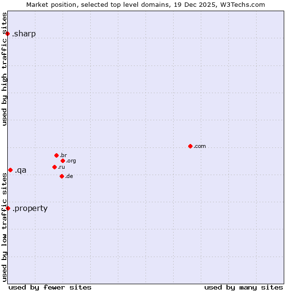 TechnologiesContent ManagementServer-side Languages Client-side Languages JavaScript Libraries CSS Frameworks Web Servers Web Panels Operating Systems Web Hosting Data Centers Reverse Proxies DNS Servers Email Servers SSL Certificate Authorities Content Delivery Traffic Analysis Tools Advertising Networks Tag Managers Social Widgets Site Elements Structured Data Markup Languages Character Encodings Image File Formats Top Level Domains Server Locations Content Languages | Technologies > Top Level Domains > Technology usage comparison Comparison of the usage statistics of .qa (Qatar) vs. .property (Property) vs. .sharp (Sharp brand) for websitesThis report shows the usage statistics of .qa (Qatar) vs. .property (Property) vs. .sharp (Sharp brand) as top level domain on the web. See technologies overview for explanations on the methodologies used in the surveys. Our reports are updated daily. UsageThis diagram shows the percentages of websites using the selected technologies. How to read the diagram: