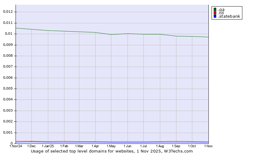 TechnologiesContent ManagementServer-side Languages Client-side Languages JavaScript Libraries CSS Frameworks Web Servers Web Panels Operating Systems Web Hosting Data Centers Reverse Proxies DNS Servers Email Servers SSL Certificate Authorities Content Delivery Traffic Analysis Tools Advertising Networks Tag Managers Social Widgets Site Elements Structured Data Markup Languages Character Encodings Image File Formats Top Level Domains Server Locations Content Languages | Technologies > Top Level Domains > Technology usage comparison Comparison of the usage statistics of .qa (Qatar) vs. .td (Chad) vs. .statebank (State Bank of India (SBI) brand) for websitesThis report shows the usage statistics of .qa (Qatar) vs. .td (Chad) vs. .statebank (State Bank of India (SBI) brand) as top level domain on the web. See technologies overview for explanations on the methodologies used in the surveys. Our reports are updated daily. UsageThis diagram shows the percentages of websites using the selected technologies. How to read the diagram: