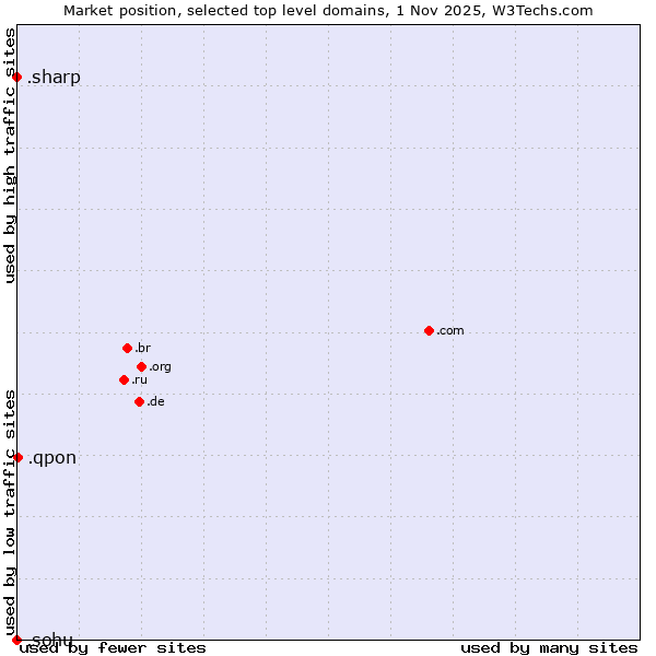 TechnologiesContent ManagementServer-side Languages Client-side Languages JavaScript Libraries CSS Frameworks Web Servers Web Panels Operating Systems Web Hosting Data Centers Reverse Proxies DNS Servers Email Servers SSL Certificate Authorities Content Delivery Traffic Analysis Tools Advertising Networks Tag Managers Social Widgets Site Elements Structured Data Markup Languages Character Encodings Image File Formats Top Level Domains Server Locations Content Languages | Technologies > Top Level Domains > Technology usage comparison Comparison of the usage statistics of .qpon (Qpon, special spelling for coupon of deals and offers) vs. .sharp (Sharp brand) vs. .sohu (Sohu brand) for websitesThis report shows the usage statistics of .qpon (Qpon, special spelling for coupon of deals and offers) vs. .sharp (Sharp brand) vs. .sohu (Sohu brand) as top level domain on the web. See technologies overview for explanations on the methodologies used in the surveys. Our reports are updated daily. UsageThis diagram shows the percentages of websites using the selected technologies. How to read the diagram: