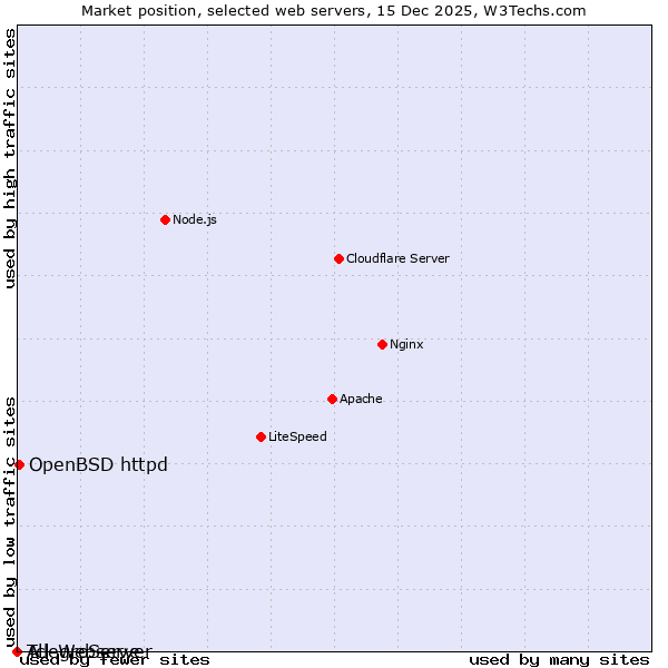 TechnologiesContent ManagementServer-side Languages Client-side Languages JavaScript Libraries CSS Frameworks Web Servers Web Panels Operating Systems Web Hosting Data Centers Reverse Proxies DNS Servers Email Servers SSL Certificate Authorities Content Delivery Traffic Analysis Tools Advertising Networks Tag Managers Social Widgets Site Elements Structured Data Markup Languages Character Encodings Image File Formats Top Level Domains Server Locations Content Languages | Technologies > Web Servers > Technology usage comparison Comparison of the usage statistics of OpenBSD httpd vs. AllegroServe vs. Tcl-Webserver for websitesThis report shows the usage statistics of OpenBSD httpd vs. AllegroServe vs. Tcl-Webserver as web server on the web. See technologies overview for explanations on the methodologies used in the surveys. Our reports are updated daily. UsageThis diagram shows the percentages of websites using the selected technologies. How to read the diagram: