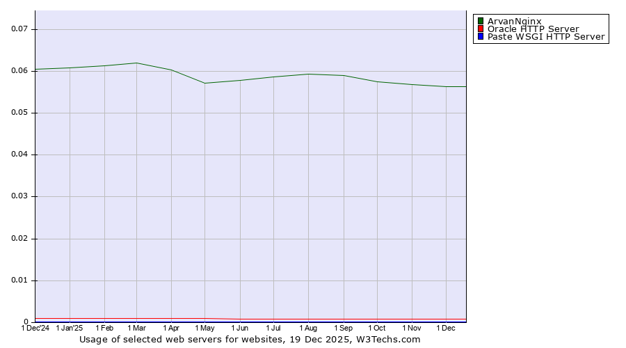 TechnologiesContent ManagementServer-side Languages Client-side Languages JavaScript Libraries CSS Frameworks Web Servers Web Panels Operating Systems Web Hosting Data Centers Reverse Proxies DNS Servers Email Servers SSL Certificate Authorities Content Delivery Traffic Analysis Tools Advertising Networks Tag Managers Social Widgets Site Elements Structured Data Markup Languages Character Encodings Image File Formats Top Level Domains Server Locations Content Languages | Technologies > Web Servers > Technology usage comparison Comparison of the usage statistics of ArvanNginx vs. Oracle HTTP Server vs. Paste WSGI HTTP Server for websitesThis report shows the usage statistics of ArvanNginx vs. Oracle HTTP Server vs. Paste WSGI HTTP Server as web server on the web. See technologies overview for explanations on the methodologies used in the surveys. Our reports are updated daily. UsageThis diagram shows the percentages of websites using the selected technologies. How to read the diagram: