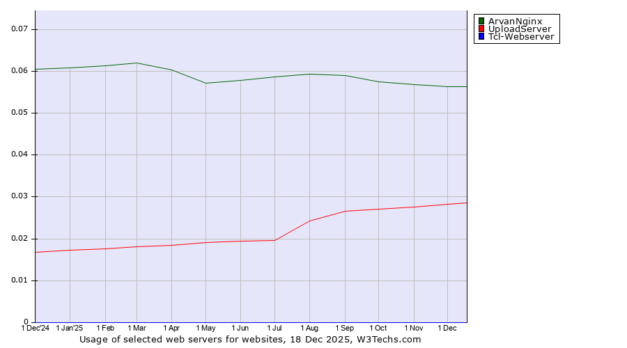 TechnologiesContent ManagementServer-side Languages Client-side Languages JavaScript Libraries CSS Frameworks Web Servers Web Panels Operating Systems Web Hosting Data Centers Reverse Proxies DNS Servers Email Servers SSL Certificate Authorities Content Delivery Traffic Analysis Tools Advertising Networks Tag Managers Social Widgets Site Elements Structured Data Markup Languages Character Encodings Image File Formats Top Level Domains Server Locations Content Languages | Technologies > Web Servers > Technology usage comparison Comparison of the usage statistics of ArvanNginx vs. UploadServer vs. Tcl-Webserver for websitesThis report shows the usage statistics of ArvanNginx vs. UploadServer vs. Tcl-Webserver as web server on the web. See technologies overview for explanations on the methodologies used in the surveys. Our reports are updated daily. UsageThis diagram shows the percentages of websites using the selected technologies. How to read the diagram: