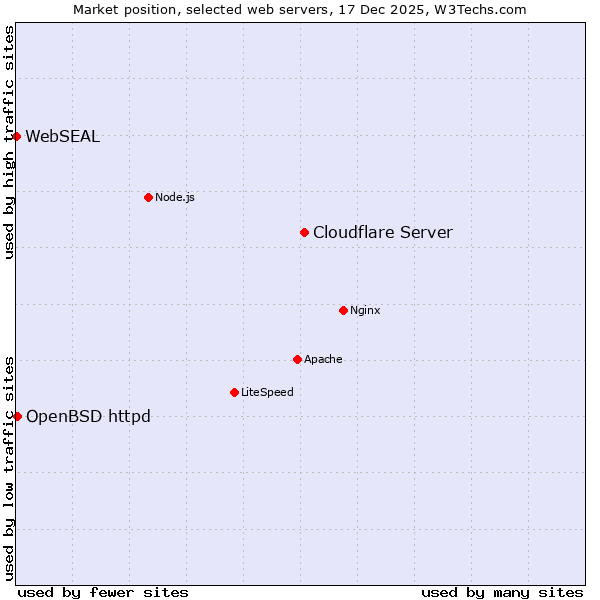 TechnologiesContent ManagementServer-side Languages Client-side Languages JavaScript Libraries CSS Frameworks Web Servers Web Panels Operating Systems Web Hosting Data Centers Reverse Proxies DNS Servers Email Servers SSL Certificate Authorities Content Delivery Traffic Analysis Tools Advertising Networks Tag Managers Social Widgets Site Elements Structured Data Markup Languages Character Encodings Image File Formats Top Level Domains Server Locations Content Languages | Technologies > Web Servers > Technology usage comparison Comparison of the usage statistics of Cloudflare Server vs. OpenBSD httpd vs. WebSEAL for websitesThis report shows the usage statistics of Cloudflare Server vs. OpenBSD httpd vs. WebSEAL as web server on the web. See technologies overview for explanations on the methodologies used in the surveys. Our reports are updated daily. UsageThis diagram shows the percentages of websites using the selected technologies. How to read the diagram: