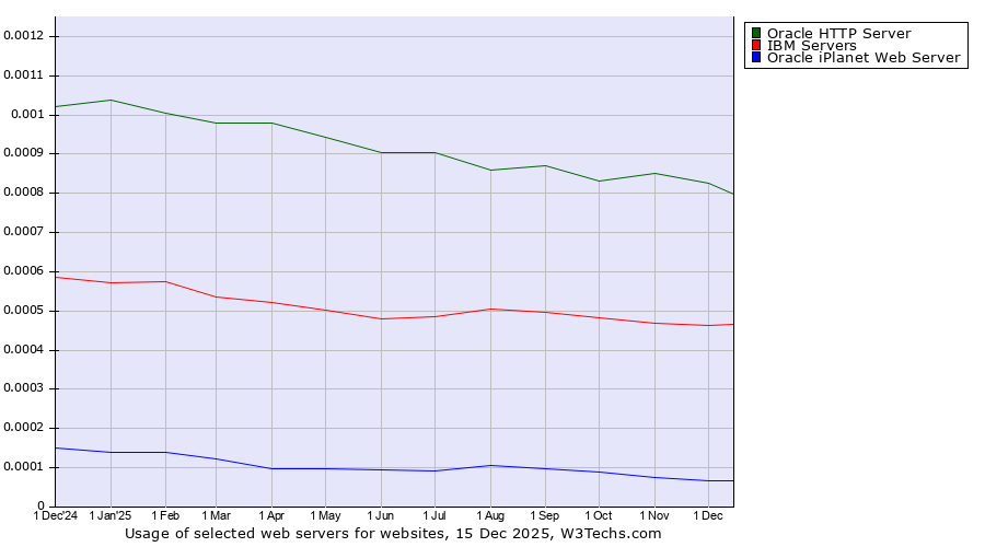 TechnologiesContent ManagementServer-side Languages Client-side Languages JavaScript Libraries CSS Frameworks Web Servers Web Panels Operating Systems Web Hosting Data Centers Reverse Proxies DNS Servers Email Servers SSL Certificate Authorities Content Delivery Traffic Analysis Tools Advertising Networks Tag Managers Social Widgets Site Elements Structured Data Markup Languages Character Encodings Image File Formats Top Level Domains Server Locations Content Languages | Technologies > Web Servers > Technology usage comparison Comparison of the usage statistics of Oracle HTTP Server vs. IBM Servers vs. Oracle iPlanet Web Server for websitesThis report shows the usage statistics of Oracle HTTP Server vs. IBM Servers vs. Oracle iPlanet Web Server as web server on the web. See technologies overview for explanations on the methodologies used in the surveys. Our reports are updated daily. UsageThis diagram shows the percentages of websites using the selected technologies. How to read the diagram: