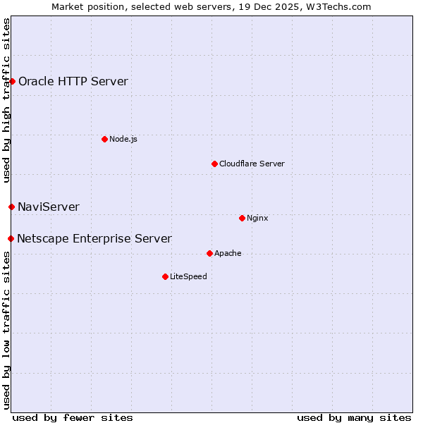 TechnologiesContent ManagementServer-side Languages Client-side Languages JavaScript Libraries CSS Frameworks Web Servers Web Panels Operating Systems Web Hosting Data Centers Reverse Proxies DNS Servers Email Servers SSL Certificate Authorities Content Delivery Traffic Analysis Tools Advertising Networks Tag Managers Social Widgets Site Elements Structured Data Markup Languages Character Encodings Image File Formats Top Level Domains Server Locations Content Languages | Technologies > Web Servers > Technology usage comparison Comparison of the usage statistics of Oracle HTTP Server vs. NaviServer vs. Netscape Enterprise Server for websitesThis report shows the usage statistics of Oracle HTTP Server vs. NaviServer vs. Netscape Enterprise Server as web server on the web. See technologies overview for explanations on the methodologies used in the surveys. Our reports are updated daily. UsageThis diagram shows the percentages of websites using the selected technologies. How to read the diagram:
