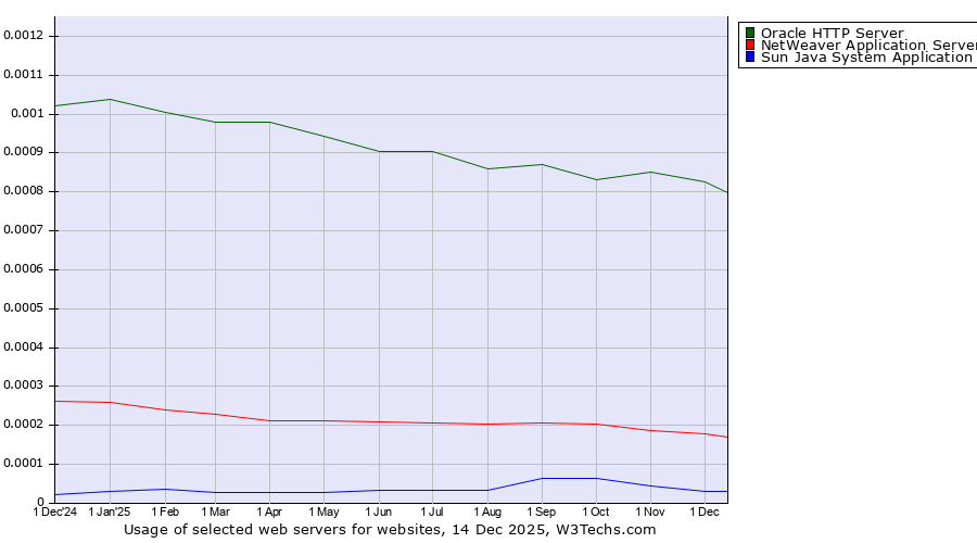TechnologiesContent ManagementServer-side Languages Client-side Languages JavaScript Libraries CSS Frameworks Web Servers Web Panels Operating Systems Web Hosting Data Centers Reverse Proxies DNS Servers Email Servers SSL Certificate Authorities Content Delivery Traffic Analysis Tools Advertising Networks Tag Managers Social Widgets Site Elements Structured Data Markup Languages Character Encodings Image File Formats Top Level Domains Server Locations Content Languages | Technologies > Web Servers > Technology usage comparison Comparison of the usage statistics of Oracle HTTP Server vs. NetWeaver Application Server vs. Sun Java System Application Server for websitesThis report shows the usage statistics of Oracle HTTP Server vs. NetWeaver Application Server vs. Sun Java System Application Server as web server on the web. See technologies overview for explanations on the methodologies used in the surveys. Our reports are updated daily. UsageThis diagram shows the percentages of websites using the selected technologies. How to read the diagram: