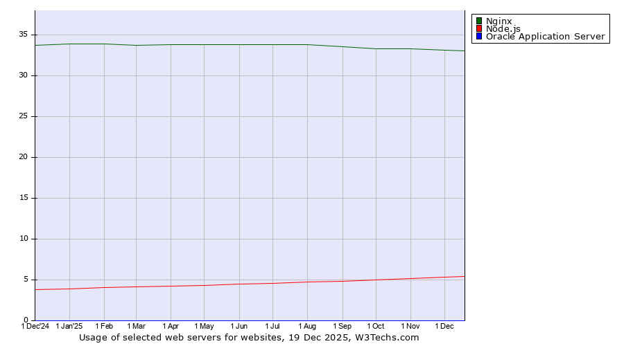 TechnologiesContent ManagementServer-side Languages Client-side Languages JavaScript Libraries CSS Frameworks Web Servers Web Panels Operating Systems Web Hosting Data Centers Reverse Proxies DNS Servers Email Servers SSL Certificate Authorities Content Delivery Traffic Analysis Tools Advertising Networks Tag Managers Social Widgets Site Elements Structured Data Markup Languages Character Encodings Image File Formats Top Level Domains Server Locations Content Languages | Technologies > Web Servers > Technology usage comparison Comparison of the usage statistics of Nginx vs. Node.js vs. Oracle Application Server for websitesThis report shows the usage statistics of Nginx vs. Node.js vs. Oracle Application Server as web server on the web. See technologies overview for explanations on the methodologies used in the surveys. Our reports are updated daily. UsageThis diagram shows the percentages of websites using the selected technologies. How to read the diagram: