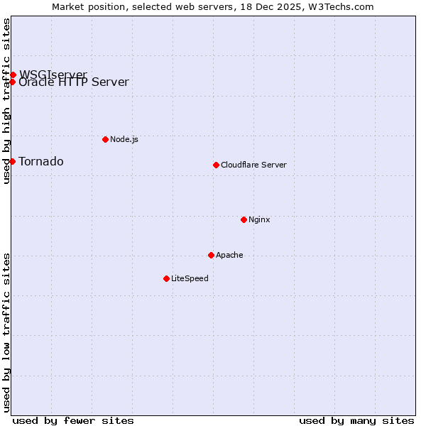 TechnologiesContent ManagementServer-side Languages Client-side Languages JavaScript Libraries CSS Frameworks Web Servers Web Panels Operating Systems Web Hosting Data Centers Reverse Proxies DNS Servers Email Servers SSL Certificate Authorities Content Delivery Traffic Analysis Tools Advertising Networks Tag Managers Social Widgets Site Elements Structured Data Markup Languages Character Encodings Image File Formats Top Level Domains Server Locations Content Languages | Technologies > Web Servers > Technology usage comparison Comparison of the usage statistics of WSGIserver vs. Tornado vs. Oracle HTTP Server for websitesThis report shows the usage statistics of WSGIserver vs. Tornado vs. Oracle HTTP Server as web server on the web. See technologies overview for explanations on the methodologies used in the surveys. Our reports are updated daily. UsageThis diagram shows the percentages of websites using the selected technologies. How to read the diagram: